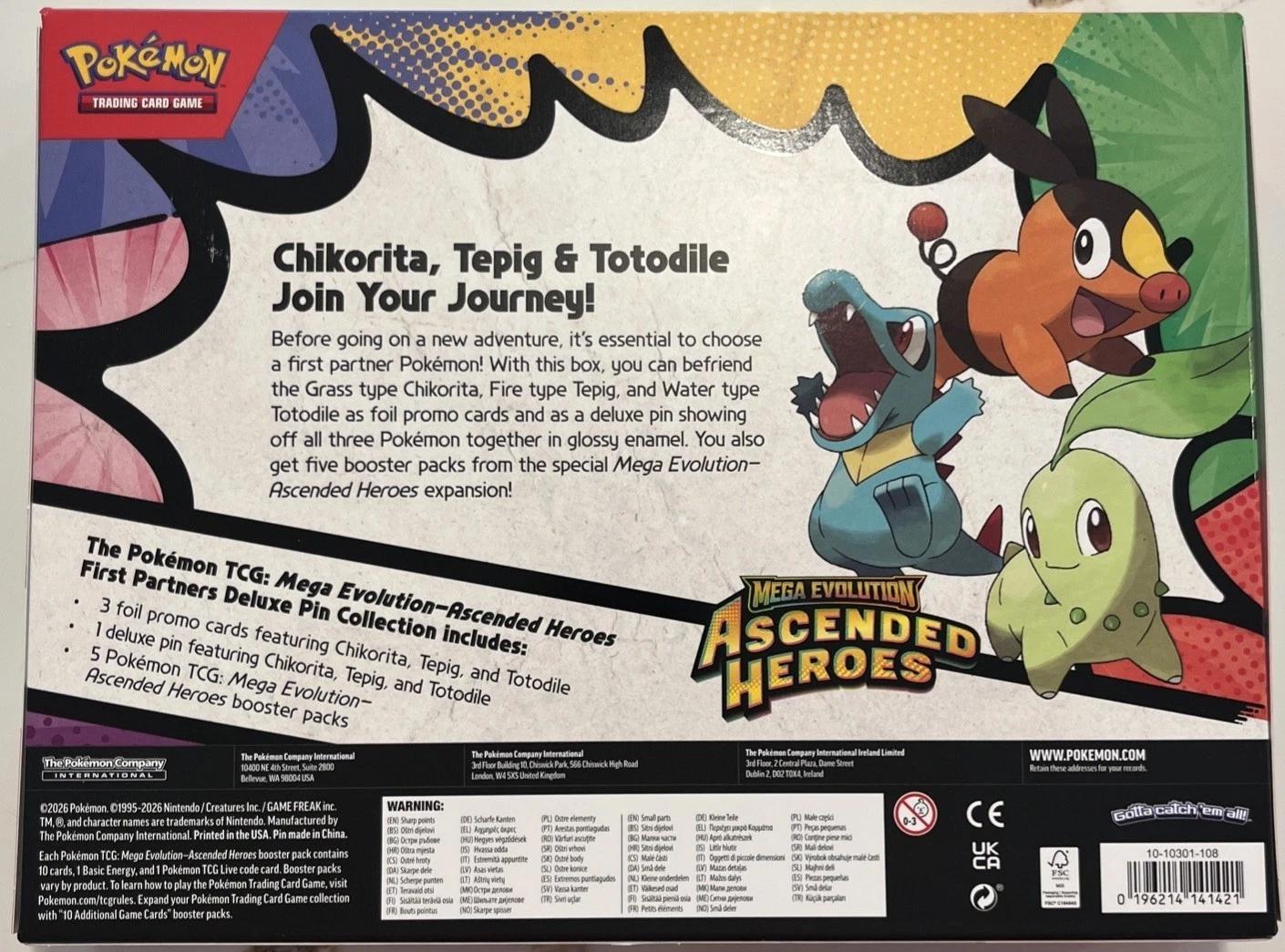 Esta edición destaca a Chikorita, Tepig y Totodile, representando los tres tipos clásicos (planta, fuego y agua) en una presentación especial dentro de la expansión Mega Evolution.
