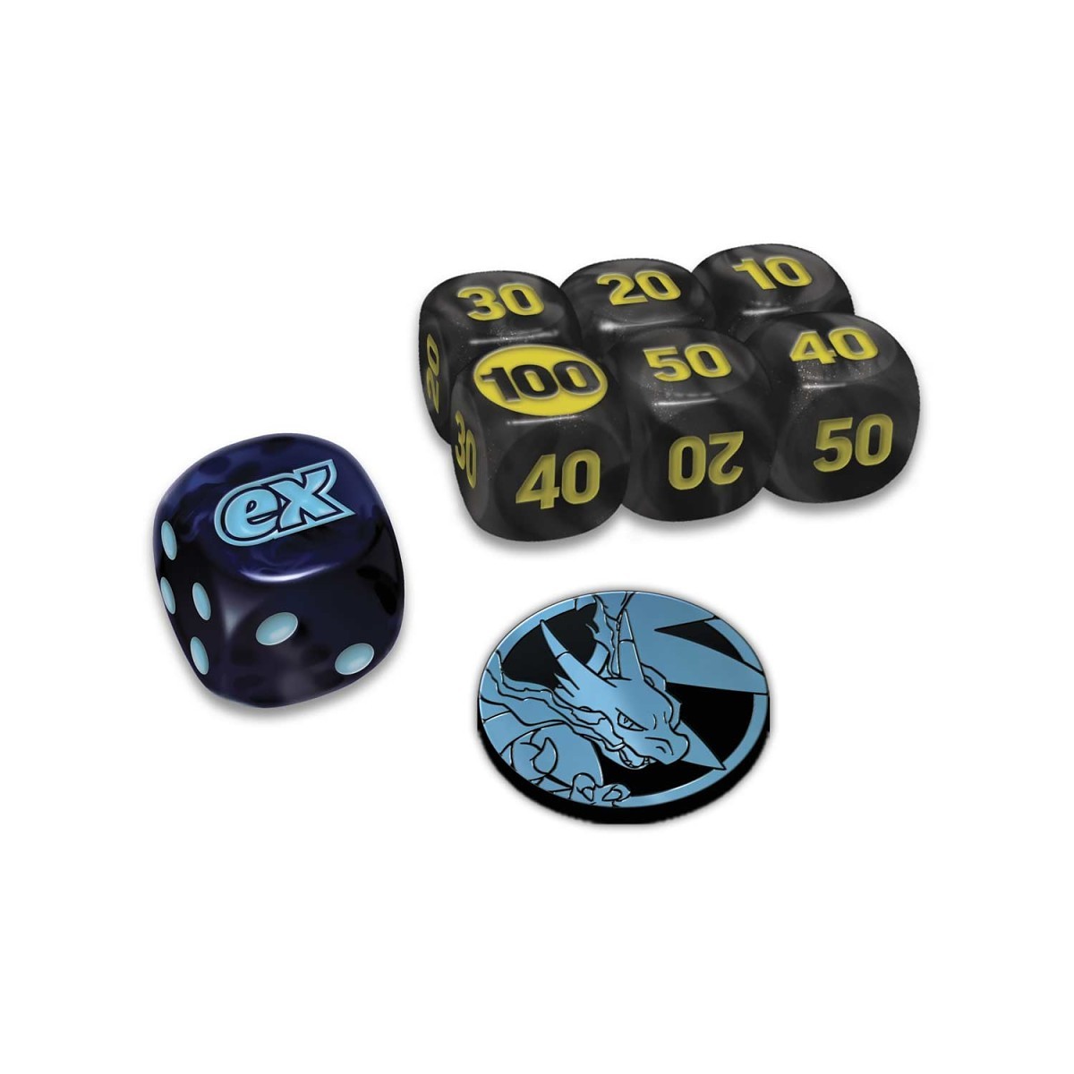 Para mantener todo organizado, la caja incluye 6 separadores, un troquel legal para competencias y una moneda plástica para lanzar en el juego. También viene con una tarjeta de código para Pokémon TCG Live, que te permite disfrutar del juego en línea.