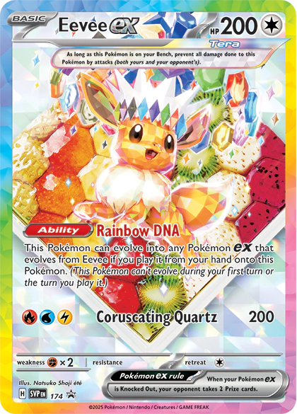Eevee y sus evoluciones transmiten amistad y alegría allá donde van, y con los adorables accesorios de esta colección, seguro que traerán esa misma alegría a tu próxima gran partida. Dentro, encontrarás una tarjeta promocional con ilustración especial de estilo raro que presenta a Eevee como un ex Pokémon Tera Estelar, listo para evolucionar gracias a su ADN Arcoíris.